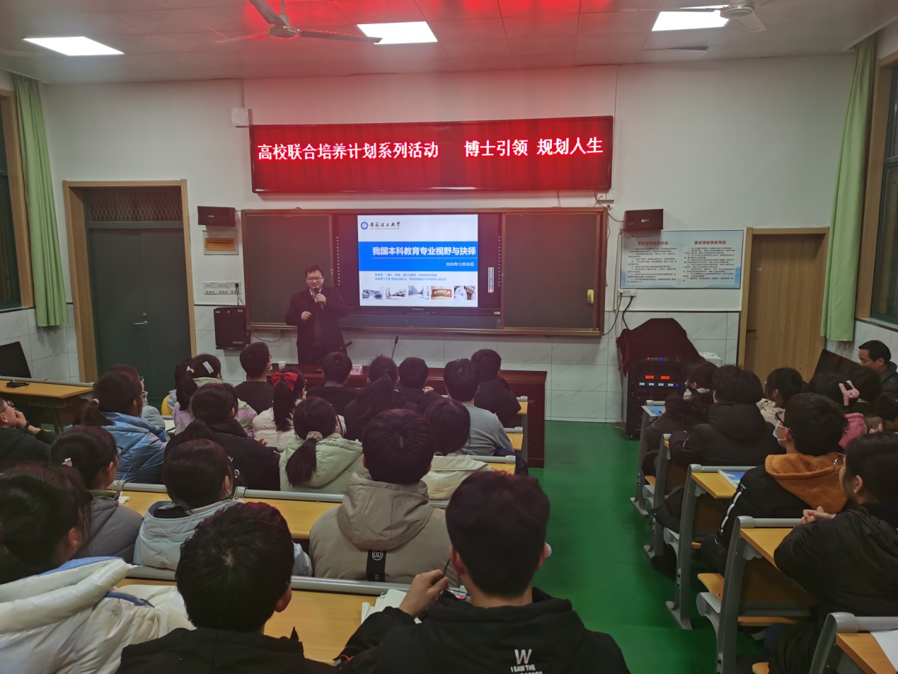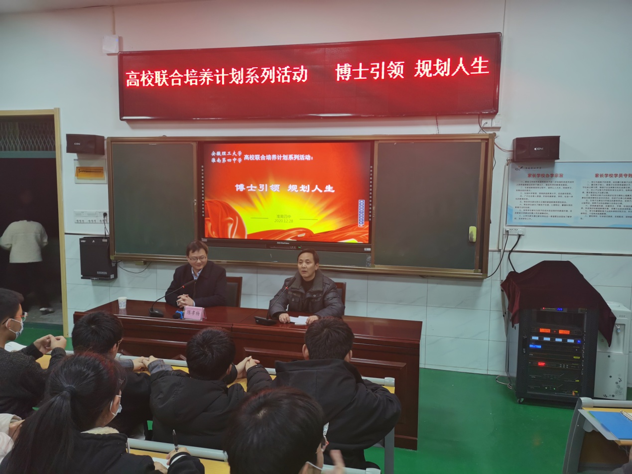 2020年12月28日,淮南四中開展了以“博士引領(lǐng)、規(guī)劃人生”為主題的高校聯(lián)合培養(yǎng)計(jì)劃系列活動(dòng)。安徽省教學(xué)名師、安徽理工大學(xué)博士生導(dǎo)師、教務(wù)處副處長(zhǎng)、教學(xué)質(zhì)量監(jiān)控與評(píng)估中心副主任陳孝楊教授蒞臨淮南四中為同學(xué)們做了一場(chǎng)精彩的報(bào)告。